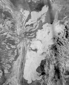 Some of the terrain in these areas is particularly efficient at reflecting radar signals.[5]:p. 1 This is possibly analogous to snow lines on Earth and is likely related to temperatures and pressures there being lower than in the other provinces due to the higher elevation, which allows for distinct mineralogy to occur.[note 1] It is thought that high-elevation rock formations may contain or be coated by minerals that have high dielectric constants.[5]:1 The high dielectric minerals would be stable at the ambient temperatures in the highlands, but not on the plains that comprise the rest of the planet's surface. Pyrite, an iron sulfide, matches these criteria and is widely suspected as a possible cause; it would be produced by chemical weathering of the volcanic highlands after long-term exposure to the sulfur-bearing Venusian atmosphere.[7] The presence of pyrite on Venus has been contested, with atmospheric modeling showing that it might not be stable under Venusian atmospheric conditions.[8] Other hypotheses have been put forward to explain the higher radar reflectivity in the highlands, including the presence of a ferroelectric material whose dielectric constant changes with temperature (with Venus having a changing temperature gradient with elevation).[9] It has been observed that the character of the radar-bright highlands is not consistent across the surface of Venus. For example, Maxwell Montes shows the sharp, snow line-like change in reflectivity that is consistent with a change in mineralogy, whereas Ovda Regio shows a more gradual brightening upwards trend. The brightening upwards trend on Ovda Regio is consistent with a ferroelectric signature, and has been suggested to indicate the presence of chlorapatite.[10]