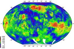 File:Hemispheric View of Venus.tif The geology of Venus is the scientific study of the surface, crust, and interior of the planet Venus. Of all the other planets in the Solar System, it is the one nearest to Earth and most like it in terms of mass, but has no magnetic field or recognizable plate tectonic system. Much of the ground surface is exposed volcanic bedrock, some with thin and patchy layers of soil covering, in marked contrast with Earth, the Moon, and Mars. Some impact craters are present, but Venus is similar to Earth in that there are fewer craters than on the other rocky planets that are largely covered by them. This is due in part to the thickness of the Venusian atmosphere disrupting small impactors before they strike the ground, but the paucity of large craters may be due to volcanic re-surfacing, possibly of a catastrophic nature. Volcanism appears to be the dominant agent of geological change on Venus. Some of the volcanic landforms appear to be unique to the planet. There are shield and composite[citation needed] volcanoes similar to those found on Earth. Given that Venus has approximately the same size, density, and composition as Earth, it is plausible that volcanism may be continuing on the planet today, as demonstrated by recent studies.[1]