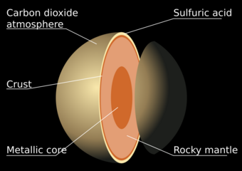 Venus's crust appears to be 20–25 kilometres (12–16 mi) thick on average, and composed of mafic silicate rocks.[18] Venus's mantle is approximately 2,840 kilometres (1,760 mi) thick, its chemical composition is probably similar to that of chondrites.[6]:1729 Since Venus is a terrestrial planet, it is presumed to have a core made of semisolid iron and nickel with a radius of approximately 3,000 kilometres (1,900 mi).[citation needed]
