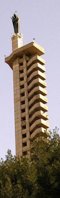 Located on a hilltop to the southwest of Zahlé, this is a 54-metre-high (177 ft) concrete tower, entirely clad in white marble, and topped with a 10-metre-tall (33 ft) bronze statue of the Virgin Mary, the work of an Italian artist. It is by far Zahlé's most prominent structure—visible from most of the city and from several miles around in the central Bekaa Valley. At its base is a chapel that can seat a little over a hundred people. The top of the tower features sweeping views over Zahlé and the Bekaa Valley.