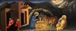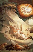 Between the 13th and 14th centuries a new sensibility towards a more naturalistic representation of reality emerged in Italy, which had as one of its contributing factors the study of a realistic light in the pictorial composition. In the frescoes of the Scrovegni Chapel (Padua), Giotto studied how to distinguish flat and curved surfaces by the presence or absence of gradients and how to distinguish the orientation of flat surfaces by three tones: lighter for horizontal surfaces, medium for frontal vertical surfaces and darker for receding vertical surfaces. Giotto was the first painter to represent sunlight, a type of soft, transparent illumination, but one that already served to model figures and enhance the quality of clothes and objects.[97] For his part, Taddeo Gaddi – in his Annunciation to the Shepherds (Baroncelli Chapel, Santa Croce, Florence) – depicted divine light in a night scene with a visible light source and a rapid fall in the pattern of light distribution characteristic of point sources of light, through contrasts of yellow and violet.[98]