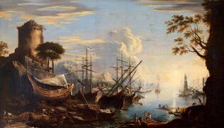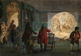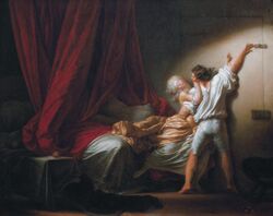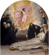 In relation to the distribution of light in the painting, it can be: "homogeneous", when it is distributed equally; "dual", in which the figures stand out against a dark background; or "insertive", when light and shadows are interrelated.[26] According to its origin, light can be intrinsic ("own or autonomous light"), when the light is homogeneous, without luminous effects, directional lights or contrasts of lights and shadows; or extrinsic ("illuminating light"), when it presents contrasts, directional lights and other objective sources of light. The first occurred mainly in Romanesque and Gothic art, and the second especially in the Renaissance and Baroque.[27] In turn, the illuminating light can occur in different ways: "focal light", when it directly presents a light-emitting object ("tangible light") or comes from an external source that illuminates the painting ("intangible light"); "diffuse light", which blurs the contours, as in Leonardo's sfumato; "real light", which aims to realistically capture sunlight, an almost utopian attempt in which artists such as Claude of Lorraine, J. M. W. Turner or the impressionist artists were especially employed; and "unreal light", which has no natural or scientific basis and is closer to a symbolic light, as in the illumination of religious figures.[28] As for the artist's intention, light can be "compositional", when it helps the composition of the painting, as in all the previous cases; or "conceptual light", when it serves to enhance the message, for example by illuminating a certain part of the painting and leaving the rest in semi-darkness, as Caravaggio used to do.[29]