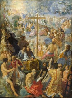In Christian iconography, light is also present in the halos of the saints, which used to be made – especially in medieval art – with a golden nimbus, a circle of light placed around the heads of saints, angels and members of the Holy Family. In Fra Angelico's The Annunciation, in addition to the halo, the artist placed rays of light radiating from the figure of the archangel Gabriel, to emphasize his divinity, the same resource he uses with the dove symbolizing the Holy Spirit.[70] On other occasions, it is God himself who is represented in the form of rays of sunlight, as in The Baptism of Christ (1445) by Piero della Francesca.[71] The rays can also signify God's wrath, as in The Tempest (1505) by Giorgione. On other occasions light represents eternity or divinity: in the vanitas genre, beams of light used to focus on objects whose transience was to be emphasized as a symbol of the ephemerality of life, as in Vanities (1645) by Harmen Steenwijck, where a powerful beam of light illuminates the skull in the center of the painting.[72]