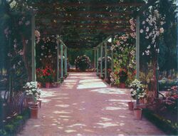 The Sitges School is generally considered a precursor of Catalan modernism: two of its main representatives, Ramon Casas and Santiago Rusiñol, spent several seasons in the town of Sitges, where they adopted the custom of painting d'après nature and assumed as the protagonist of their works the luminosity of the environment that surrounded them, although with other formal and compositional solutions in which the influence of French painting is evident. Casas studied in Paris, where he was trained in impressionism, with special influence of Degas and Whistler. His technique stands out for the synthetic brushstroke and the somewhat blurred line, with a theme focused preferably on interiors and outdoor images, as well as popular scenes and social vindication. Rusiñol showed a special sensitivity for the capture of light especially in his landscapes and his series of Gardens of Spain – he especially loved the gardens of Mallorca (the sones) and Granada – in which he developed a great ability for the effects of light filtered between the branches of the trees, creating unique environments where light and shadow play capriciously. Likewise, Rusiñol's light shows the longing for the past, for the time that flees, for the instant frozen in time whose memory will live on in the artist's work.