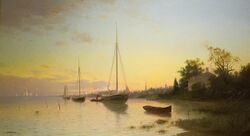 Eugène Boudin, one of the first landscape painters to paint outdoors, especially seascapes, also stood out as an independent artist. He achieved great mastery in the elaboration of skies, shimmering and slightly misty skies of dim and transparent light, a light that is also reflected in the water with instantaneous effects that he knew how to capture with spontaneity and precision, with a fast technique that already pointed to impressionism – in fact, he was Monet's teacher.[148]