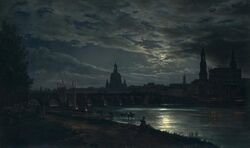 The Norwegian Johan Christian Dahl moved in the wake of Friedrich, although with a greater interest in light and atmospheric effects, which he captured in a naturalistic way, thus moving away from the romantic landscape. In his works he shows a special interest in the sky and clouds, as well as misty and moonlit landscapes. In many of his works the sky occupies almost the entire canvas, leaving only a narrow strip of land occupied by a solitary tree.[144]
