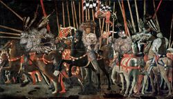 Another aspect in which light is a determining factor is in time, in the representation of chronological time in painting. Until the Renaissance, artists did not represent a specific time in painting and, in general, the only difference in light was between exterior and interior lights. In many occasions it is difficult to identify the specific time of day in a work, since neither the direction of the light nor its quality nor the dimension of the shadows are decisive elements to recognize a certain time of day. Night was rarely represented until practically Mannerism and, in the cases in which a nocturnal atmosphere was used, it was because the narrative required it or because of some symbolic aspect: in Giotto's The Annunciation to the Shepherds or in Ambrogio Lorenzetti's Annunciation, the nocturnal atmosphere contributes to accentuate the halo of mystery surrounding the birth of Christ; in Uccello's Saint George and the Dragon, night represents evil, the world in which the dragon lives. On the other hand, even in narrative themes that take place at night, such as the Last Supper or the supper at Emmaus, this factor is sometimes deliberately avoided, as in Andrea del Sarto's Last Supper, set in daylight.[50]