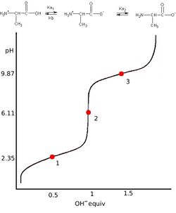 Due to the successive dissociation processes, there are two equivalence points in the titration curve of a diprotic acid.[14] The first equivalence point occurs when all first hydrogen ions from the first ionization are titrated.[15] In other words, the amount of OH− added equals the original amount of H2A at the first equivalence point. The second equivalence point occurs when all hydrogen ions are titrated. Therefore, the amount of OH− added equals twice the amount of H2A at this time. For a weak diprotic acid titrated by a strong base, the second equivalence point must occur at pH above 7 due to the hydrolysis of the resulted salts in the solution.[15] At either equivalence point, adding a drop of base will cause the steepest rise of the pH value in the system.