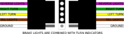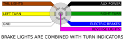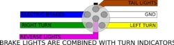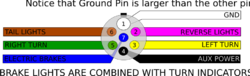 This contact is less common, and may have completely different wiring than that shown here. The wiring is same as for the 6-pin round connector with center pin (Reversing lamps) excluded.