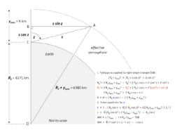 where the normalized heights of the atmosphere and of the collector are respectively [math]\displaystyle{ r = R_\mathrm E / y_\mathrm{atm} }[/math] ≈ 708 (as above) and [math]\displaystyle{ c = h / y_\mathrm{atm} }[/math] .