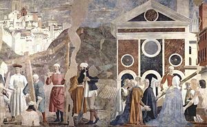 In the late Middle Ages and Early Renaissance, there was a wide general acceptance of the origin of the True Cross and its history preceding the Crucifixion, as recorded by Voragine. This general acceptance is confirmed by the numerous artworks that depict this subject, culminating in one of the most famous fresco cycles of the Renaissance, the Legend of the True Cross by Piero della Francesca, painted on the walls of the chancel of the Church of San Francesco in Arezzo between 1452 and 1466, in which he reproduces faithfully the traditional episodes of the story as recorded in The Golden Legend.