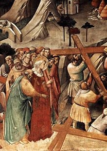 After many centuries the tree was cut and the wood used to build a bridge over which the Queen of Sheba passed, on her journey to meet King Solomon. So struck was she by the portent contained in the timber of the bridge that she fell on her knees and worshipped it. On her visit to Solomon she told him that a piece of wood from the bridge would bring about the replacement of God's Covenant with the Jewish people, by a new order. Solomon, fearing the eventual destruction of his people, had the timber buried. But after fourteen generations, the wood taken from the bridge became the Cross of the Crucifixion. Voragine then goes on to describe its finding by Helena, mother of the Emperor Constantine.[15]