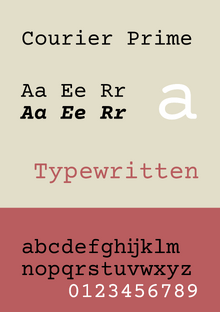 This Courier typeface, developed by Alan Dague-Greene with funding from John August and Quote-Unquote Apps, includes a true Italic style. Courier Prime matches the metrics of Courier New and Courier Final Draft, with some design changes and improvements aimed at greater legibility and beauty. The typeface was released in January 2013 under the SIL Open Font License.[13] In 2016 the family was extended with Sans Serif and Code versions. By mid-2018 the family included Semi-Bold and Medium versions (designed by M. Babek Aliassa) and a Cyrillic alphabet version (designed by Ivan Gladkikh[14]). All fonts in the family are downloadable for free and can be used in any application.[15][10]