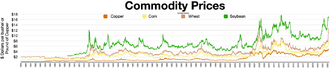 In 2012, as emerging-market economies slowed down, commodity prices peaked and started to decline. From 2005 through 2013, energy and metals' real prices remained well above their long-term averages. In 2012, real food prices were their highest since 1982.[28]