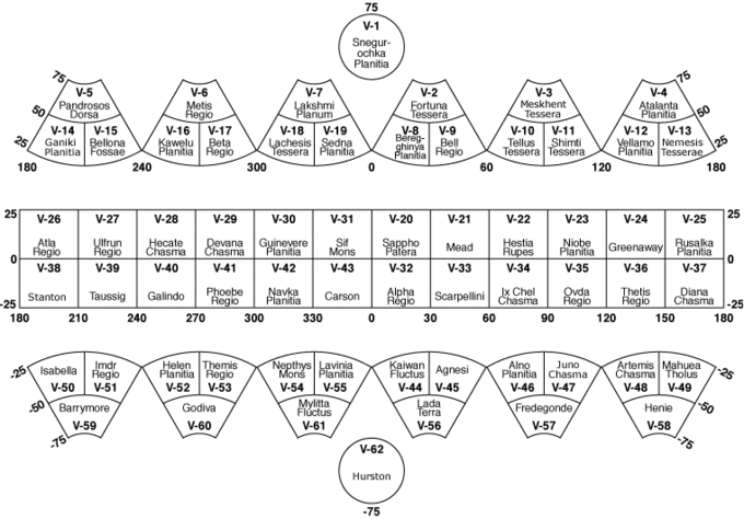 From Handwiki The Quadrangle of Henie is one of the 62 quadrilateral defined by the cartography of Venus approved by the International Astronomical Union.[1]