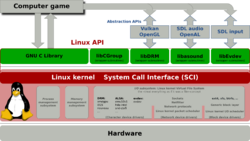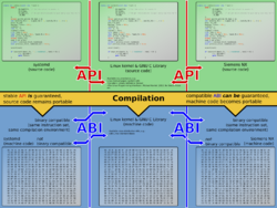 The Linux kernel and GNU C Library together form the Linux API. After compilation, the binaries offer an ABI.