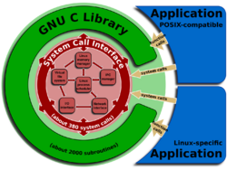 The GNU C Library is a wrapper around the system calls of the Linux kernel.
