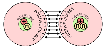 A substantial energy barrier must be overcome before fusion can occur. At large distances two naked nuclei repel one another because of the repulsive electrostatic force between their positively charged protons. If two nuclei can be brought close enough together, however, the electrostatic repulsion can be overcome by the nuclear force which is stronger at close distances.