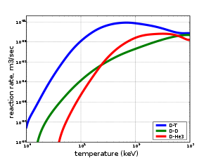increases from virtually zero at room temperatures up to meaningful magnitudes at temperatures of 10–100 keV. At these temperatures, well above typical ionization energies (13.6 eV in the hydrogen case), the fusion reactants exist in a plasma state.