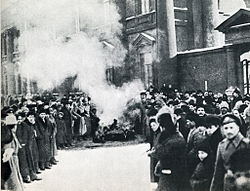 On 10 March, the Tsar started taking the movement seriously. But then he made an even more stupid decision by ordering his troops in the city to disperse the protesters by shooting at them with live ammunition, calling the protests "impermissible".[25] However, Petrograd soldiers proved unwilling to shoot Petrograd civilians, and some units actually attacked other units that had tried to obey the Tsar's orders. Other units outright joined the protesters in the streets, and at least one unit shot its commanding officer instead of firing on protesters.[20] In the absence of the military, government authority in the capital broke down completely.