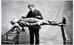 Braid was well aware of similar performances by "electro-biologists" in his day;[5] e.g., Braid published the contents of an advertising hand-bill for an "electro-biology" performance by a visiting American, George W. Stone,[6] on 12 March 1851, which, as well as clearly emphasizing that Stone was claiming to use volunteers from the audience, rather than his own stooges/assistants, details some of the phenomena that Stone's audience might have expected to have displayed to them.