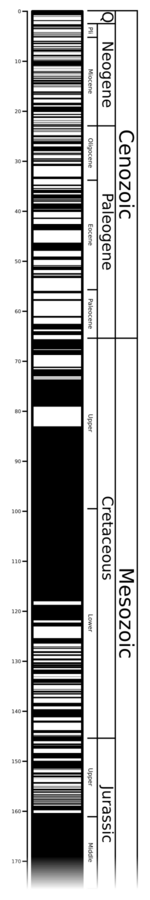 The Cretaceous Normal (also called the Cretaceous Superchron or C34) lasted for almost 40 million years, from about 120 to 83 million years ago, including stages of the Cretaceous period from the Aptian through the Santonian. The frequency of magnetic reversals steadily decreased prior to the period, reaching its low point (no reversals) during the period. Between the Cretaceous Normal and the present, the frequency has generally increased slowly.[13]