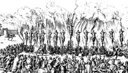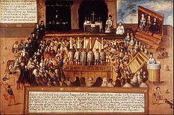 The auto-da-fé involved a Catholic Mass, prayer, a public procession of those found guilty, and a reading of their sentences.[127] They took place in public squares or esplanades and lasted several hours; ecclesiastical and civil authorities attended. Artistic representations of the auto-da-fé usually depict torture and the burning at the stake. This type of activity never took place during an auto-da-fé, which was in essence a religious act. Torture was not administered after a trial concluded, and executions were always held after and separate from the auto-da-fé,[128] though in the minds and experiences of observers and those undergoing the confession and execution, the separation of the two might be experienced as merely a technicality.