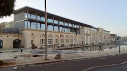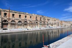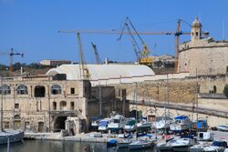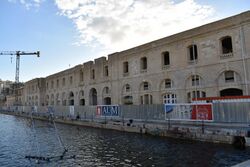 The British Building was built between 1841 and 1844 as a workshop within Dock no. 1, which was being constructed for the British Royal Navy.[39] Its architect was William Scamp, who also designed the rest of the dockyard, and some alterations were carried out in the late 19th and early 20th centuries.[40] The building was damaged by aerial bombardment during World War II,[39] and repairs and alterations made after the war were unsympathetic to the building's aesthetics. An almost identical building which was located on the opposite side of the dry dock was demolished between 1972 and 1974. This is regarded as destruction of cultural heritage,[40] but it led to the creation of an open space which was rehabilitated and opened to the public in 2014.[41]