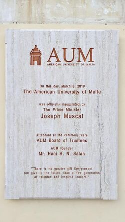 On 5 May 2015, the Jordanian entrepreneur Hani Salah and the Government of Malta signed an agreement at Auberge de Castille for the former to set up a private educational institution called the American University of Malta (AUM).[8][9] Initially the university was planned to be located in Spain , but the owner of Sadeen, Hani Salah, was persuaded to establish it in Malta by the then-Prime Minister of Malta, Joseph Muscat.[5][10][11]