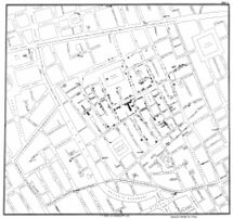 Public health efforts have been based on analysis and use of spatial data for many years. Dr. John Snow (physician), often credited as the father of epidemiology, is arguably the most famous of those examples.[2] Dr. Snow used a hand-drawn map to analyze the geographic locations of deaths related to cholera in London in the mid-1850s. His map, which superimposed the locations of cholera deaths with those of public water supplies, pinpointed the Broad Street pump as the most likely source of the cholera outbreak. Removal of the pump handle led to a rapid decline in the incidence of cholera, helping the medical community to eventually conclude that cholera was a water-borne disease.