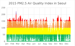 Air pollution is a major issue in Seoul.[60][61][62][63] According to the 2016 World Health Organization Global Urban Ambient Air Pollution Database,[64] the annual average PM2.5 concentration in 2014 was 24 micrograms per cubic meter (1.0×10−5 gr/cu ft), which is 2.4 times higher than that recommended by the WHO Air Quality Guidelines[65] for the annual mean PM2.5. The Seoul Metropolitan Government monitors and publicly shares real-time air quality data.[66]