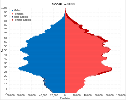 Seoul proper is noted for its population density, which is almost twice that of New York City and eight times greater than Rome. Its metropolitan area was the most densely populated among OECD countries in Asia in 2012, and second worldwide after that of Paris.[78] As of 2015, the population was 9.86 million,[79] in 2012, it was 10.44 million. As of 2021, the population is 9.59 million.[80][81] As of the end of June 2011, 10.29 million Republic of Korea citizens lived in the city. This was a 0.24% decrease from the end of 2010. The population of Seoul has been dropping since the early 1990s, the reasons being the high costs of living, urban sprawling to Gyeonggi region's satellite bed cities and an aging population.[79]