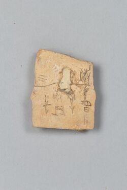 The ceramic ritual vessel vats that bear these cinnabar inscriptions were all unearthed within the palace area of this site. They were unearthed mostly in the sacrificial pits holding cow skulls and cow horns, but also in other architectural areas. The inscriptions are written on the exterior and interior of the rim, and the exterior of the belly of the large type of vats. The characters are mostly written singly; character compounds or sentences are rarely seen.[12]