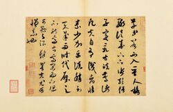 - The characters must fit their context.[4] All reputable calligraphers in China were well educated and well read. In addition to calligraphy, they were skilled in other areas, most likely painting, poetry, music, opera, martial arts, and Go. Therefore, their abundant education contributed to their calligraphy. A calligrapher practicing another calligrapher's characters would always know what the text means, when it was created, and in what circumstances. When they write, their characters' shape and weight agrees with the rhythm of the phrases, especially in less constrained styles such as semi-cursive and cursive. One who does not know the meaning of the characters they write, but varies their shape and weight on a whim, does not produce good calligraphy.