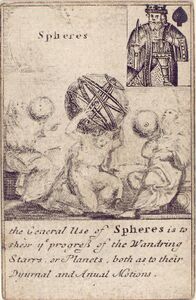 Deck of playing cards illustrating engineering instruments, England, 1702. King of spades: Spheres