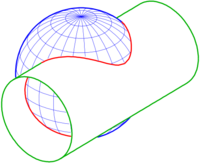 The intersection of the sphere with equation [math]\displaystyle{ \; x^2+y^2+z^2=r^2\; }[/math] and the cylinder with equation [math]\displaystyle{ \;(y-y_0)^2+z^2=a^2, \; y_0\ne 0\; }[/math] is not just one or two circles. It is the solution of the non-linear system of equations