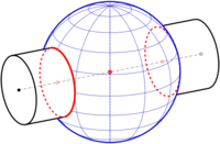 More complicated surfaces may intersect a sphere in circles, too: the intersection of a sphere with a surface of revolution whose axis contains the center of the sphere (are coaxial) consists of circles and/or points if not empty. For example, the diagram to the right shows the intersection of a sphere and a cylinder, which consists of two circles. If the cylinder radius were that of the sphere, the intersection would be a single circle. If the cylinder radius were larger than that of the sphere, the intersection would be empty.