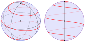 Special cases are: Viviani's curve ([math]\displaystyle{ c=1 }[/math]) and spherical spirals ([math]\displaystyle{ c\gt 2 }[/math]) such as Seiffert's spiral. Clelia curves approximate the ground track of satellites in polar orbit.