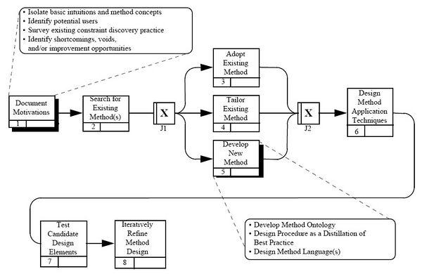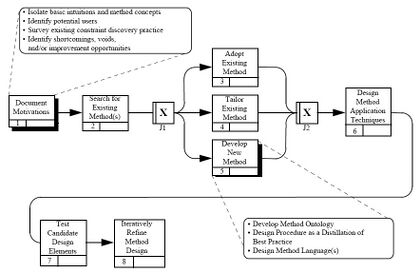 The developers of the IDEF modeling languages, Richard J. Mayer et al. (1995), have developed an early approach to method engineering from studying common method engineering practice and experience in developing other analysis and design methods. The following figure provides a process-oriented view of this approach. This image uses the IDEF3 Process Description Capture method to describe this process where boxes with verb phrases represent activities, arrows represent precedence relationships, and "exclusive or" conditions among possible paths are represented by the junction boxes labeled with an "X.".[1]