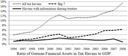 A tax haven is a state, country or territory where certain taxes are levied at a low rate or not at all, which are used by businesses for tax avoidance and tax evasion.[52] Individuals and/or corporate entities can find it attractive to move themselves to areas with reduced taxation. This creates a situation of tax competition among governments. Taxes vary substantially across jurisdictions.[53] Sovereign states have theoretically unlimited powers to enact tax laws affecting their territories, unless limited by previous international treaties. The central feature of a tax haven is that its laws and other measures can be used to evade or avoid the tax laws or regulations of other jurisdictions.[54] In its December 2008 report on the use of tax havens by American corporations,[55] the U.S. Government Accountability Office regarded the following characteristics as indicative of a tax haven: nil or nominal taxes; lack of effective exchange of tax information with foreign tax authorities; lack of transparency in the operation of legislative, legal or administrative provisions; no requirement for a substantive local presence; and self-promotion as an offshore financial center.