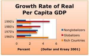 Per capita GDP growth in the post-1980 globalizers accelerated from 1.4 percent a year in the 1960s and 2.9 percent a year in the 1970s to 3.5 percent in the 1980s and 5.0 percent in the 1990s. This acceleration in growth is even more remarkable given that the rich countries saw steady declines in growth from a high of 4.7 percent in the 1960s to 2.2 percent in the 1990s. Also, the non-globalizing developing countries did much worse than the globalizers, with the former's annual growth rates falling from highs of 3.3 percent during the 1970s to only 1.4 percent during the 1990s. This rapid growth among the globalizers is not simply due to the strong performances of China and India in the 1980s and 1990s—18 out of the 24 globalizers experienced increases in growth, many of them quite substantial."[24]