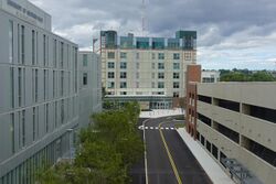 In 2021, the university removed the Woodbury Campus Center and broke ground on the 210,000 square foot, 580-bed Portland Commons dorm,[44] which opened in August 2023. It has 385 studios, single, double and four-person apartments with views of the city and Casco Bay. The dorm is open to USM upperclassmen, USM graduate students, University of Maine School of Law students and Southern Maine Community College upperclassmen.[45]