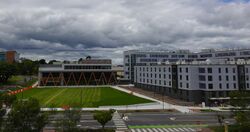 The McGoldrick Center for Career & Student Success and the adjacent Bean Green grassy quad also opened to students in August 2023. The McGoldrick Center includes a dining hall, a career center, and multiple student lounges. Across the street from the dorm is a 500-space parking garage, which is the largest Level Two charging station in Maine with 58 electric vehicle charging stations and storage for more than 250 bicycles.[46] The buildings were built with green building techniques. Portland Commons is the second largest passive house building at an American university.[47]