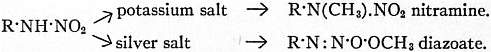 By oxidizing potassium benzene iso-diazotate with alkaline potassium ferricyanide, E. Bamberger (Ber., 1894, 27, p. 914) obtained the diazoic acids, R·NH·NO2, substances which he had previously prepared by similarly oxidizing the diazonium salts, by dehydrating the nitrates of primary amines with acetic anhydride, and by the action of nitric anhydride on the primary amines. Concentrated acids convert them into the isomeric nitro-amines, the -NO2 group going into the nucleus in the ortho- or para- position to the amine nitrogen; this appears to indicate that the compounds are nitramines. They behave, however, as tautomeric substances, since their alkali salts on methylation give nitrogen ethers, whilst their silver salts yield oxygen ethers:
