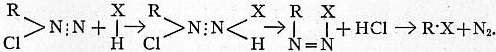 2. Replacement of -NH2 by halogens and by the -CN and -CNO groups:—The diazonium salt is warmed with an acid solution of the corresponding cuprous salt (T. Sandmeyer, Ber., 1884, 17, p. 2650), or with copper powder (L. Gattermann, Ber., 1890, 23, p. 1218; 1892, 25, p. 1074). In the case of iodine, the substitution is effected by adding a warm solution of potassium iodide to the diazonium solution, no copper or cuprous salt being necessary; whilst for the production of nitriles a solution of potassium cuprous cyanide is used. This reaction (the so-called “Sandmeyer” reaction) has been investigated by A. Hantzsch and J. W. Blagden (Ber., 1900, 33, p. 2544), who consider that three simultaneous reactions occur, namely, the formation of labile double salts which decompose in such a fashion that the radical attached to the copper atom wanders to the aromatic nucleus; a catalytic action, in which nitrogen is eliminated and the acid radical attaches itself to the aromatic nucleus; and finally, the formation of azo compounds.