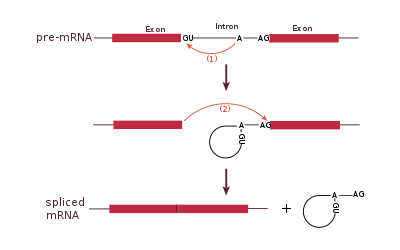 Spliceosomal and self-splicing transesterification reactions occur via two sequential transesterification reactions. First, the 2'OH of a specific branchpoint nucleotide within the intron, defined during spliceosome assembly, performs a nucleophilic attack on the first nucleotide of the intron at the 5' splice site, forming the lariat intermediate. Second, the 3'OH of the released 5' exon then performs a nucleophilic attack at the first nucleotide following the last nucleotide of the intron at the 3' splice site, thus joining the exons and releasing the intron lariat.[26]