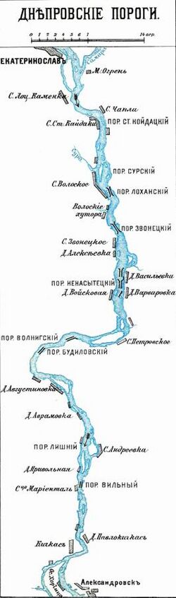 The Dnieper Rapids (Ukrainian: Дніпрові пороги) also known as Cataracts of the Dnieper were the historical rapids on the Dnieper river in Ukraine, composed of outcrops of granites, gneisses and other types of bedrock of the Ukrainian Shield. The rapids began below the present-day city of Dnipro (formerly Kodak Fortress, Yekaterinoslav), where the river turns to the south, and dropped 50 meters in 66 kilometers, ending before the present-day city of Zaporizhzhia (whose name literally means "beyond the rapids").