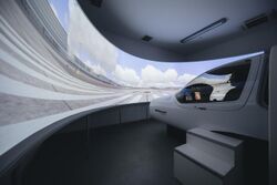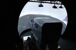 There are many parameters in visual system design. For a narrow field of view, a single display may be sufficient, however typically multiple projectors are required. This arrangement needs additional calibration, both in terms of distortion from not projecting on a flat surface, as well as brightness in regions with overlapping projections.[43] There are also different shapes of screens used, including cylindrical,[44] spherical[43] or ellipsoidal. The image can be projected on the viewing side of the projection screen, or alternatively "back-projection" onto a translucent screen.[45] Because the screen is much closer than objects outside aircraft, for simulators with multiple pilots, there are special collimated displays that eliminate the parallax effect between the pilots' point of view.[46]