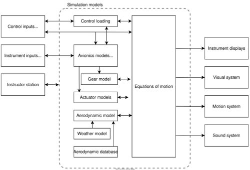 While different models need to exchange data, most often they can be separated into a modular architecture, for better organisation and ease of development.[36][37] Typically, gear model for ground handling would be separate input to the main equations of motion. Each engine and avionics instrument is also a self-contained system with well-defined inputs and outputs.