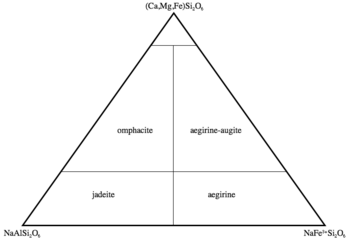 Magnesium, calcium, and iron are by no means the only cations that can occupy the X and Y sites in the pyroxene structure. A second important series of pyroxene minerals are the sodium-rich pyroxenes, corresponding to nomenclature shown in Figure 3. The inclusion of sodium, which has a charge of +1, into the pyroxene implies the need for a mechanism to make up the "missing" positive charge. In jadeite and aegirine, this is added by the inclusion of a +3 cation (aluminium and iron(III), respectively) on the X site. Sodium pyroxenes with more than 20 mol. percent calcium, magnesium or iron(II) components are known as omphacite and aegirine-augite, with 80 percent or more of these components the pyroxene falls in the quadrilateral shown in figure 1.